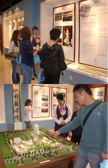的导游志愿者纷纷涌动,带领校友分队参观小和山校区校园风光,记者跟随其中一组来到了校史馆,见证了历史性的时刻。校史馆以主题划分成多个展厅,校友们进入校史馆后,首先就赞叹学校发展之好,学校历史保存完好,校友们的照片也在展台上进行陈列。在看到学院路校区的模型后,校友们激动的向我们示意了他们的教室,介绍了他们当时的学校情况,感慨万千。尚用厅内展示了学校近几年的教学发展,在解说员的帮助下,校友们对母校有了更深的了解。在经过国际厅时,校友们聊起当年中德合作办学的优势,谈到母校的这一特色,校友们不禁竖起了大拇指。