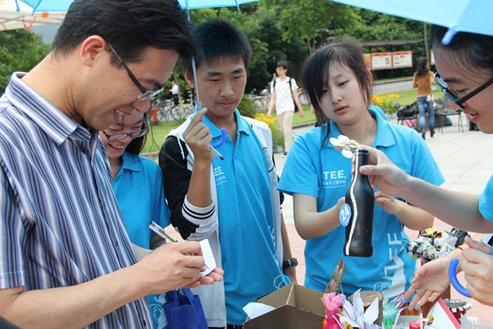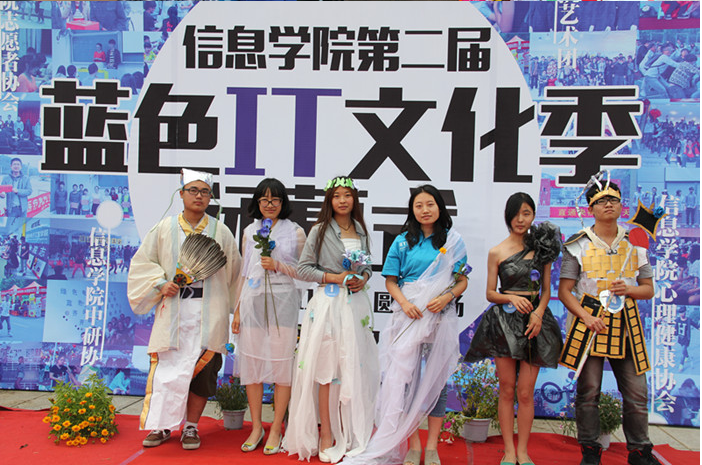 12点20分,“信息蓝—扇子舞”首先登场。蓝色的伞伴随着音乐与阳光,拉开了闭幕式的帷幕。接着,“变废为宝”展示开始,学生会成员一件件自制的“艺术品”登场。这些令人耳目一新的作品,赢得了在场观众的热烈掌声。同时进行的跳蚤市场,吸引了不少同学甚至外国留学生,驻足挑选。随后,“T台环保服装秀”闪亮登场,一件件用环保材料制作的创意服装,在模特身上展示出了别样的美丽,不说美轮美奂,却都是同学们巧思构想、精心设计的结果,别样的材质展示了别样的美丽。最后,杏吧