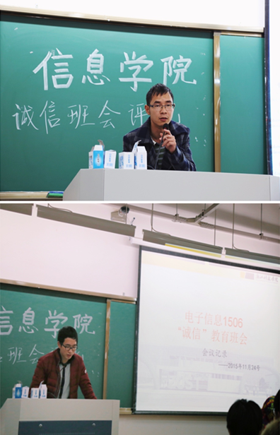 在安吉校区A-208教室开展“诚信教育”主题班会评比活动。院辅导员吕兵兵出席并担任评委。各班班长、团支书及班级代表共三十余人参加了本次活动。