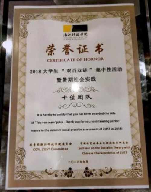 红色起航社会实践团队以总成绩第六的成绩获评浙江科技学院2018大学生“双百双进”集中性活动暨暑期社会实践十佳团队。