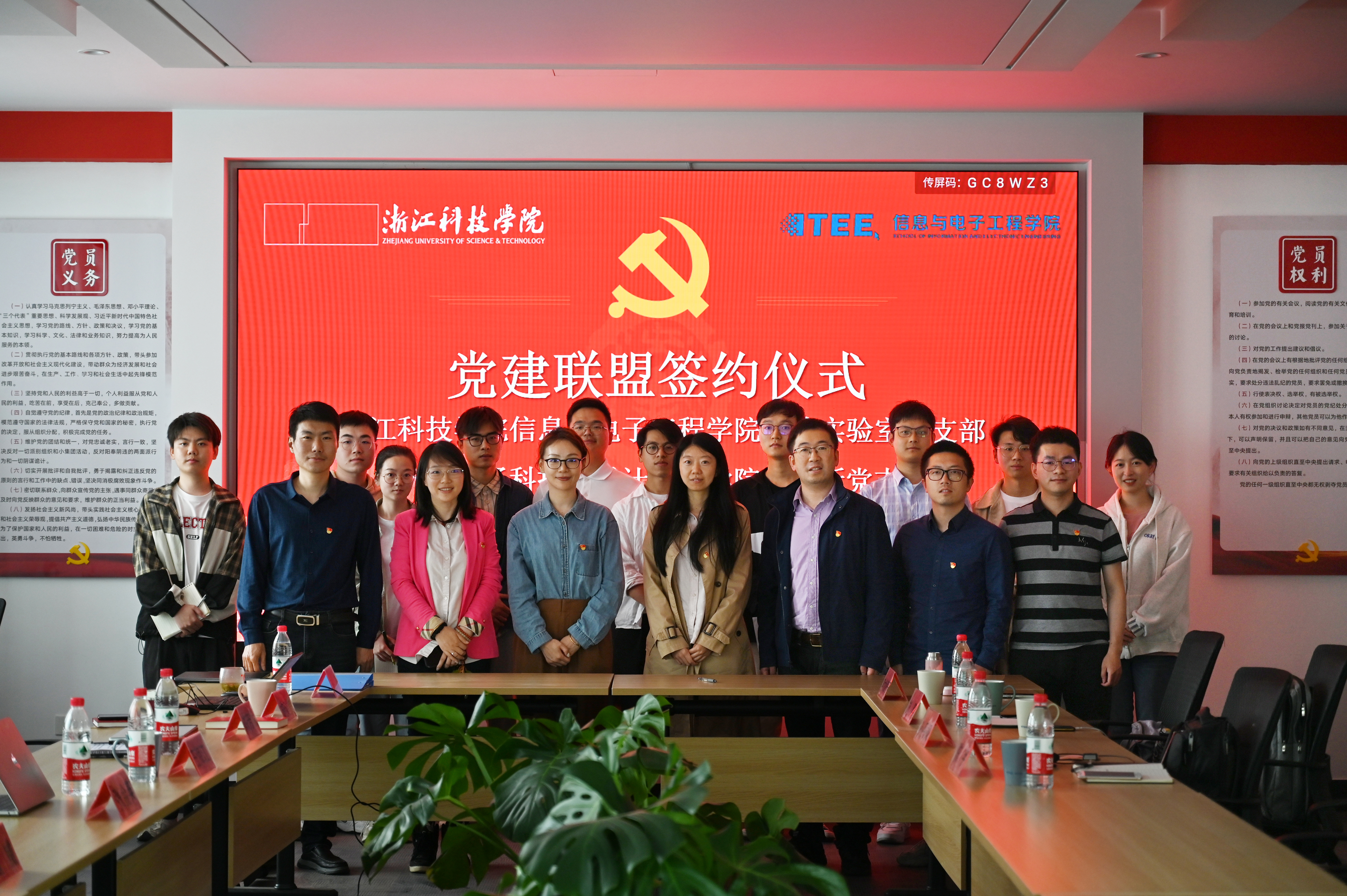 党委书记张蕾、党委副书记施建腾、比特实验室党支部书记陈芳妮、杭州电子科技大学计算机学院智能所党支部书记李尤慧子出席本次签约仪式,智能所党支部支委、比特实验室全体党员参加会议。