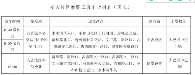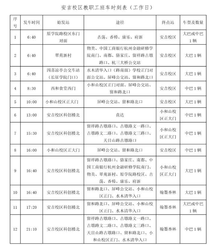 根据学校教学安排,2020年5月25日起安吉校区开始全面线下上课,教职工班车同步恢复正常运行(每周日下午16:00由西和食堂西门出发至安吉的应急班车5月24日开始正常运行,周一上午7:00由科创楼返回小和山),具体安排如下:
